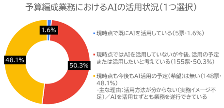AI活用状況は、導入済みの自治体はまだ限定的ながら「今後活用(検討)したい」という回答が約半数を占める結果となった。