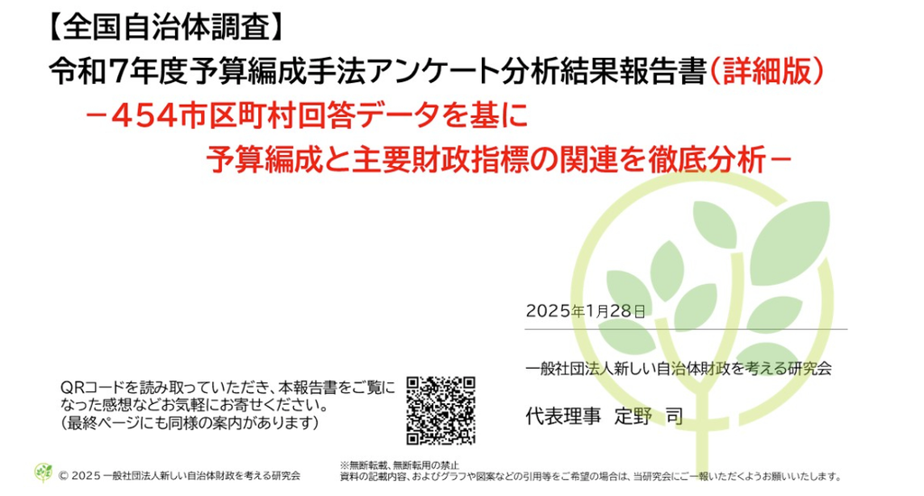 会員限定ページで公開している、令和6年9月27日~10月18日に実施した「令和7年度予算編成手法アンケート調査」の回答(454市区町村)のデータを基に予算編成と主要財政指標の関連を分析した報告書の閲覧・ダウンロードができます。