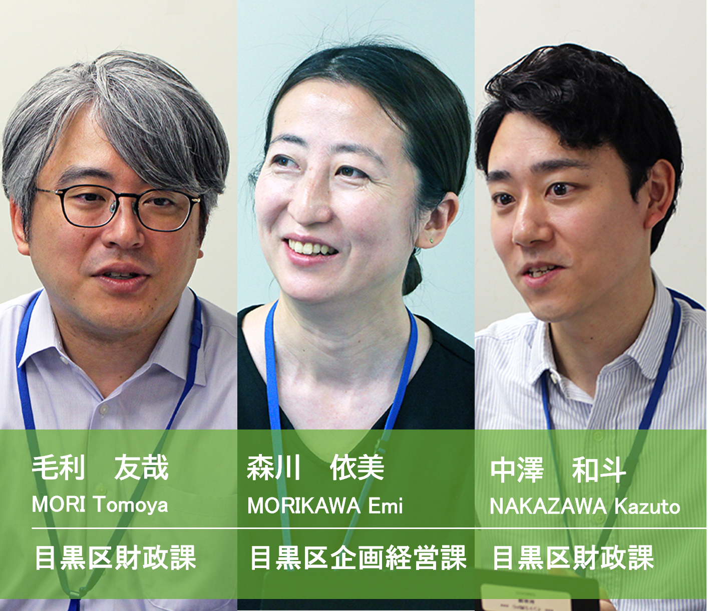 今回は財政部門と企画部門の連携で現場の情報共有をスムーズに実施している、目黒区財政課の毛利友哉さん、中澤和斗さん、企画経営課の森川依美さんにお話を伺いました。