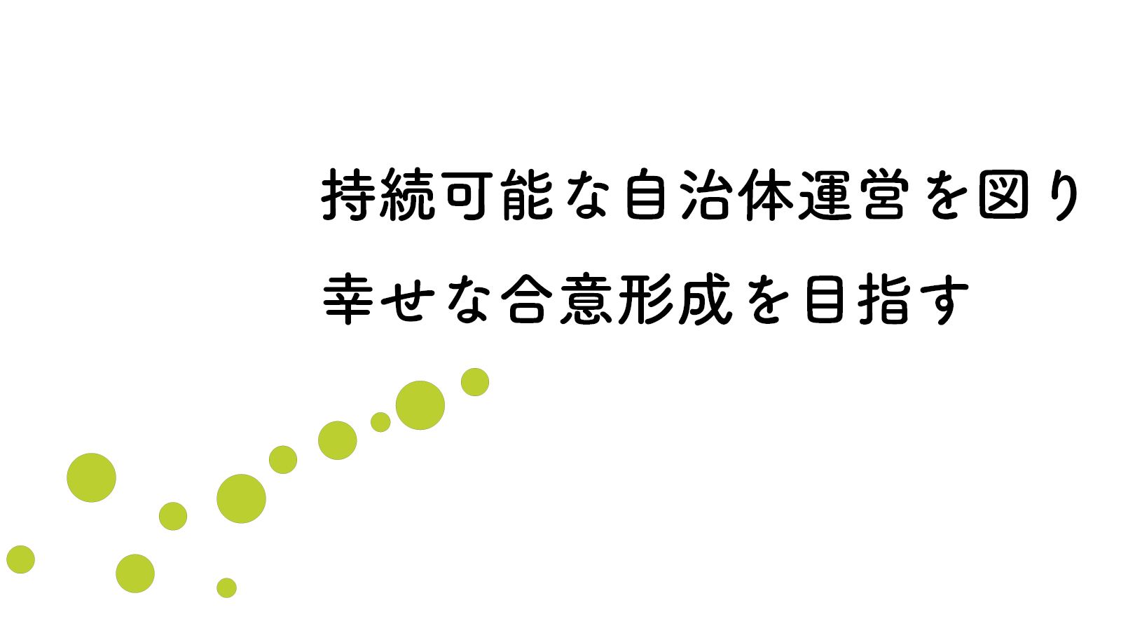 この共通の課題に、自治体関係の有志が協働して取り組み、共通の「解」を創り、改革を進めることによって地域住民、首長、議会、そして職員の「幸せな合意形成」を実現し、将来にわたり持続可能な自治体運営を図ります。