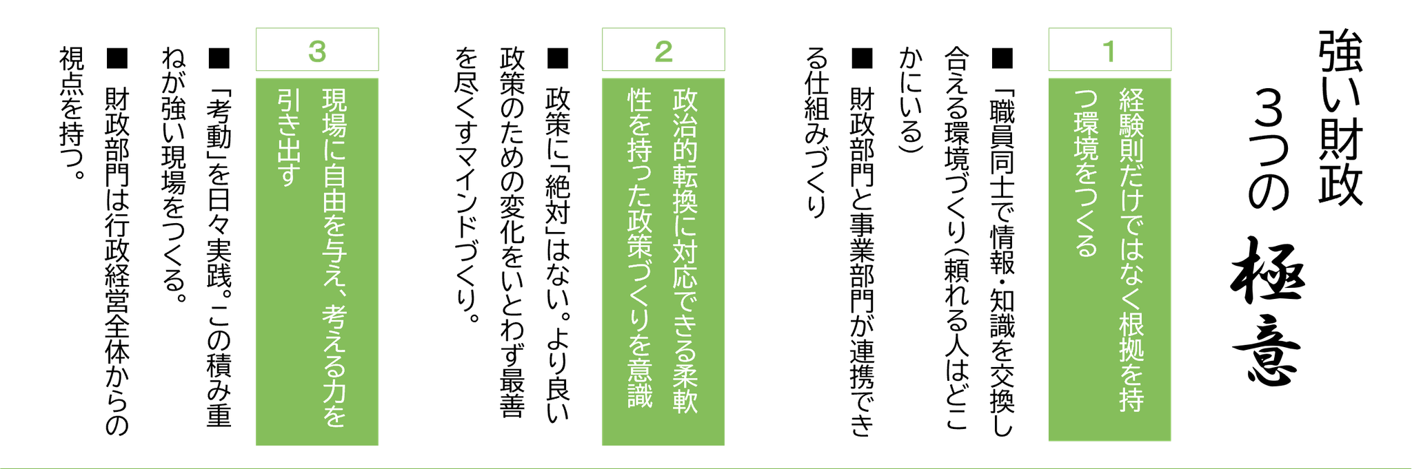 財ラボは今回のパネルディスカッションで交わされた議論を全国自治体とりわけ財政課職員に形式知化して届ける使命を感じ、改めて登壇者の方々に「強い財政を生む極意」を伺い「3つの極意」としてまとめた。