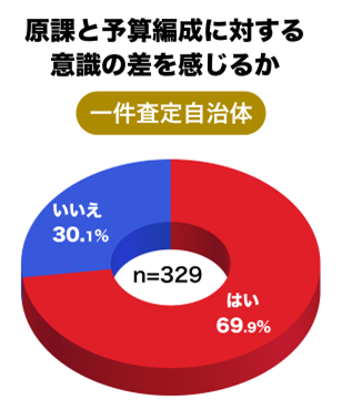 なお、一件査定を導入している自治体(市区町村及び都道府県)では、「原課と予算編成に対する意識の差を感じる」と答えた自治体が69.9%(n=329)と、約7割が原課との温度差を感じている結果となり、最早全国共通の課題となっていることが明らかとなった。