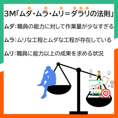 また、業務を遂行する上では、いわゆる〝3M〟の発生を可能な限り排除していくための取り組みを続けていくことが求められる。〝3M〟とは、『ムダ・ムラ・ムリ』の頭文字をとった呼び名だが、それぞれの語尾をとって「ダラリの法則」とも呼ばれている。これは、経営資源(人・モノ・金・情報)の問題点を洗い出すためのフレームワークであり、作業能率を下げる要因の3要素を列挙したものである。