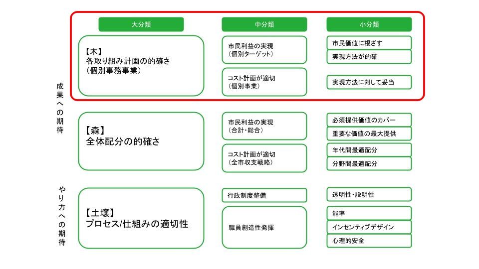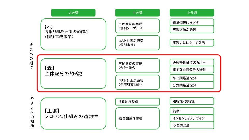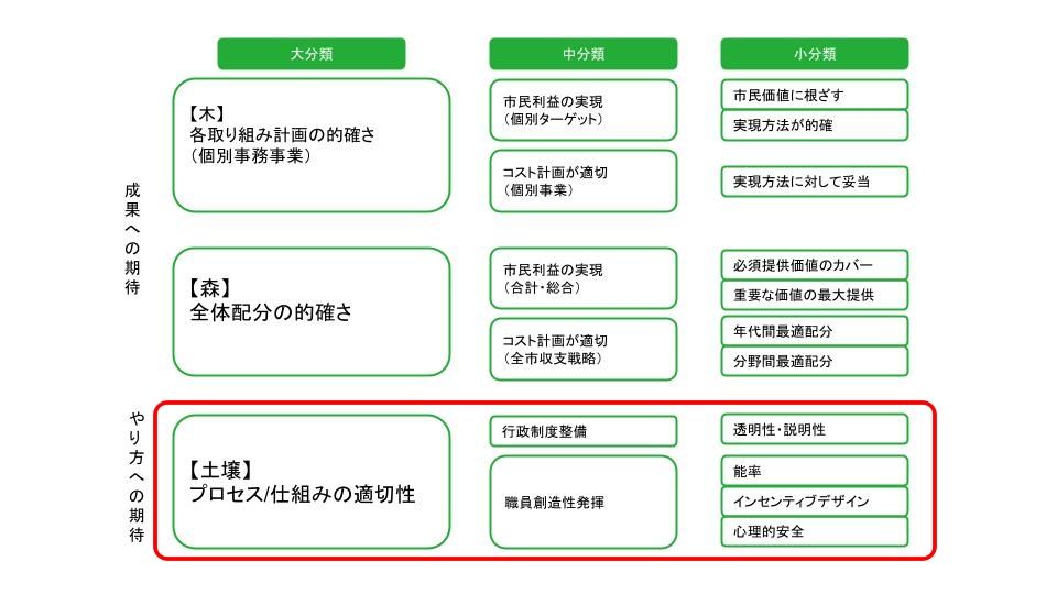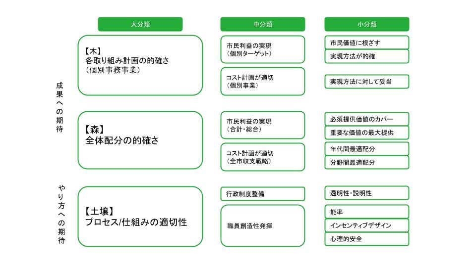 「幸せな合意形成ができる新しい予算編成」をゴールに置くと、エレメントは「予算をしっかりと組めている」という意味で「成果があること」と、それらを編成していく「やり方への期待」という2つに大別されます。